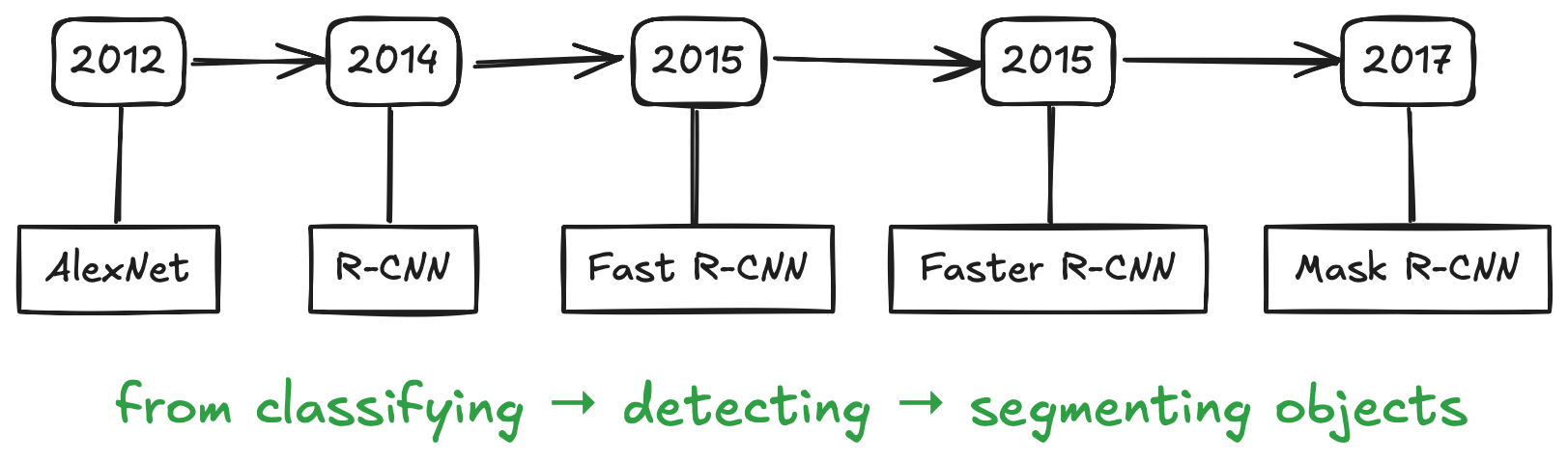 - Follow the historical path of neural networks from R-CNN1 → Fast R-CNN2 → Faster R-CNN3 → Mask R-CNN4, seeing how each new design solved a real problem from the previous one.