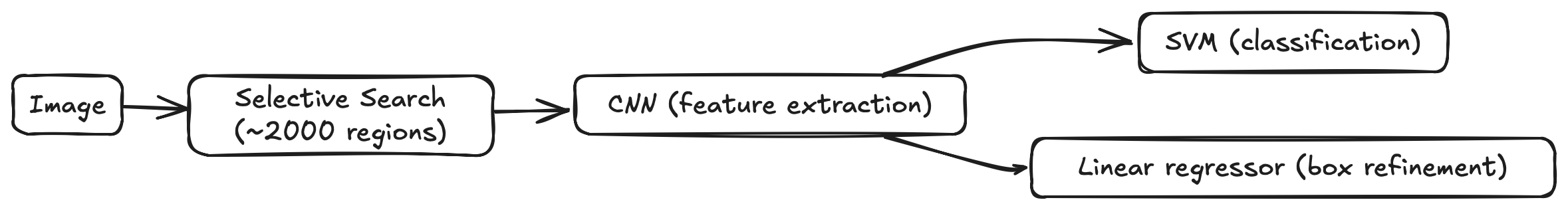 | R-CNN | 2014 | Detect objects using region proposals + independent CNNs. | Selective Search regions | Separate CNN per region | SVM + regressor |